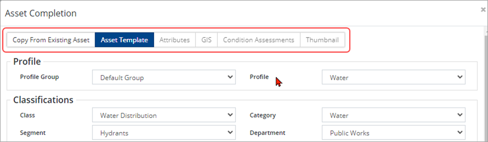 2. Click Asset Template to assign a profile and complete classification and field The remaining tabs (Attributes, GIS, etc.) become available once an in-service date has been entered or the Exclude from PSAB flag has been set to yes.